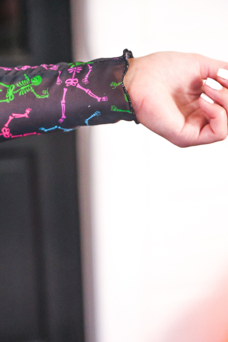 Get trendy with the Keigan Mesh Top in a colorful skeleton print! This playful top features lettuce hems, a mock neckline, and a sheer mesh material that can be layered under or over any outfit. Don't miss out on this must have piece!