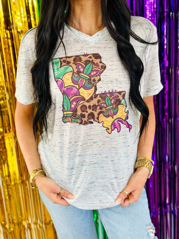 Louisiana Leopard Mardi Gras V-Neck Tee