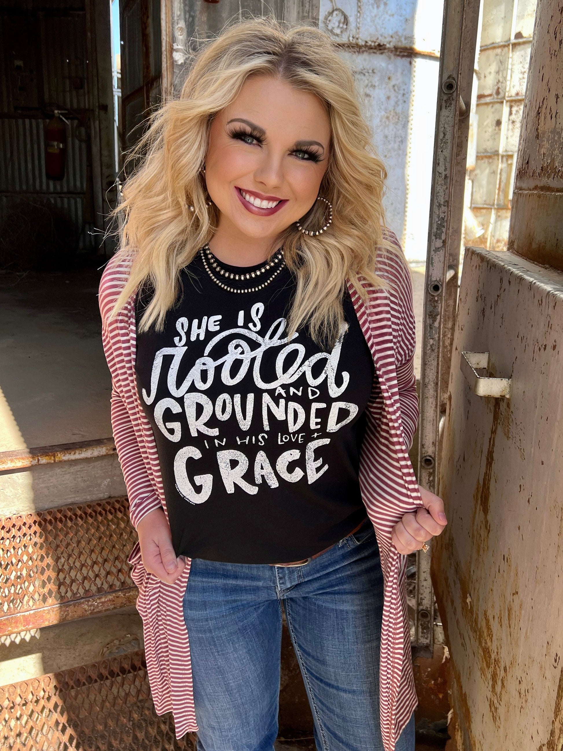 Our striped cardigan--a customer FAVE! The spring mauve hue is one you can't live without! The perfect length and weight to wear all season long.
