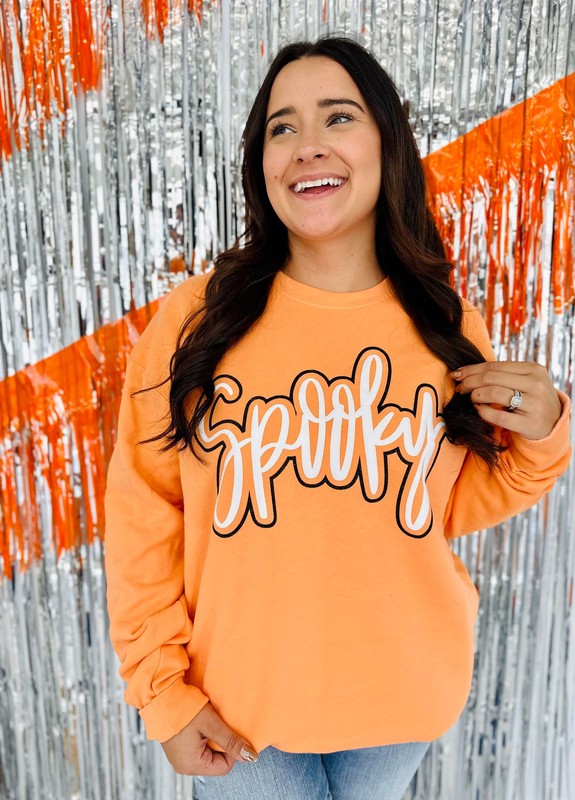 Spooky Double. Black Glitter, White puff. Cantaloupe Fleece Sweatshirt.